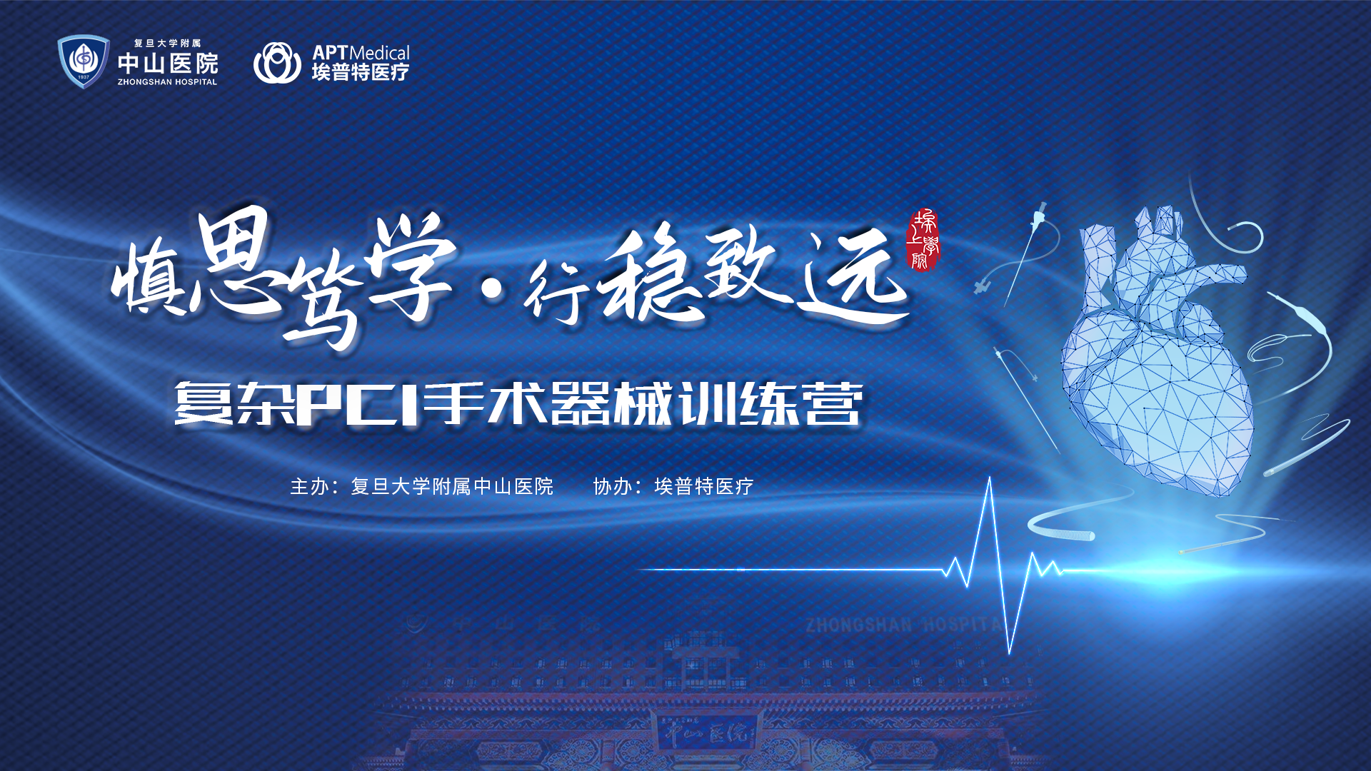 “慎思篤學·行穩致遠—復雜PCI手術器械訓練營”依托復旦大學附屬中山醫院,旨在通過專業且系統的培訓和講解,加強廣大青年醫生對于復雜PCI的學習與交流,培養和規范廣大青年醫生對于微導管、錨定球囊及延伸導管等復雜PCI手術器械的使用理念與操作習慣,從而達到提高青年醫生手術水平,改善患者預后,減輕患者負擔的目的。
